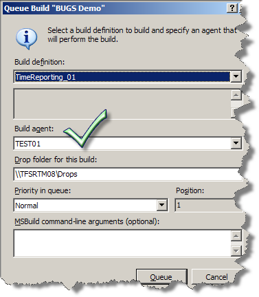 As the developers are done and have checked in their code and binding files, they are ready to create a Build Type. They do this through the Team Explorer add-in, after which they’ll make a small modification to the build script (as described in the Mikaels introductory post). After this – all they have to do is to “Queue New Build” and choose the Build Agent running on the TEST1 machine. No parameters required.
