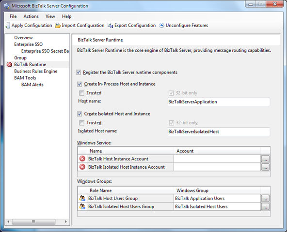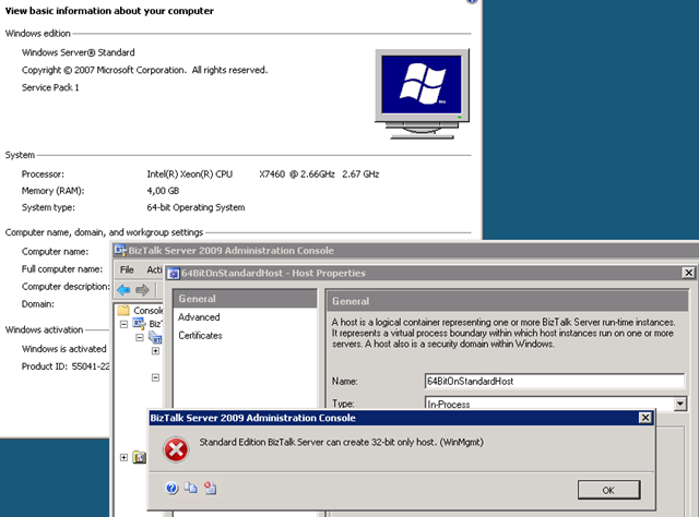 I didn’t have access to machines (or time) to test right then, but after getting back I tested and true enough you are not allowed to create a 64-bit host. The UI stops you. As you can see, this doesn’t stop BizTalk Server Standard from being installed on a 64-bit machine – it just doesn’t get the benefits of 64-bit processing.