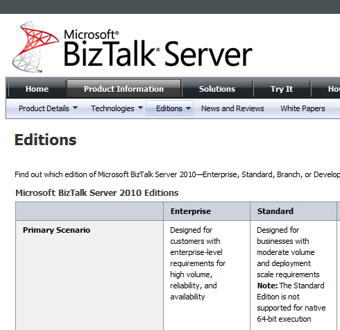 I was kind of suprised when I saw this blog post. Saying that 64-bit processing wasn’t allowed with Standard Edition of BizTalk. Since I was at PDC at the time I asked the people there who were (without me putting words in their mouths) equally suprised. At the time they couldn’t see either a licensing or technical reason as to why that would be so. And to add to that it was strange that Branch was allowed while Standard was not.