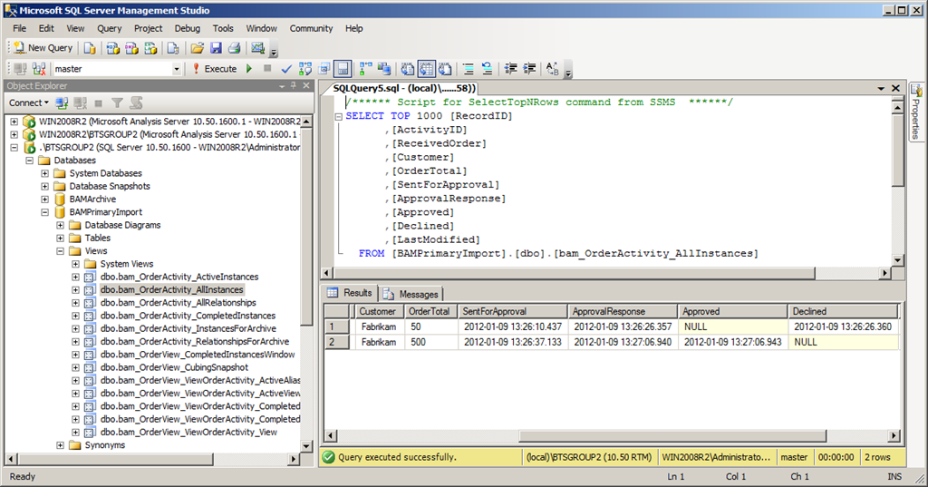 BizTalk Server behaves as expected. After running some sample data through the integration I could open my BAMPrimaryImportDb and run a Select against it to view my data.