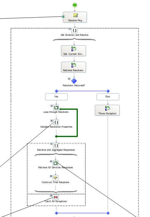 The ServiceDispatcher.odx receives the message and gathers some metadata. It then maps the message to the required request format (determined by a BRE policy lookup). It does the maping by using API calls rather then by using the map shape, allowing it to stay generic and untyped. It then calls an untyped passthrough dynamic request-response port, whose location is determined from the location passed in, originating in the itinerary. Remember this orchestration was started by looping the resolvers. It then maps the response to the required response format (which is made up of some status information and an Any node, and send the response, through the MessageBox, back to the broker orchestration. Should an exception occur the same response message is sent back containing information saying that a fault has happened.